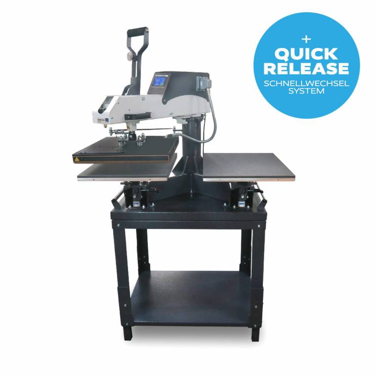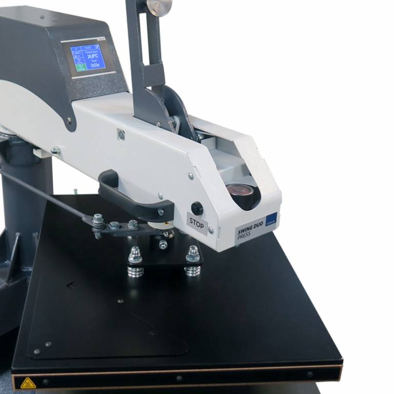 A Swing Duo Press hőprés a préselési idő letelte után automatikusan kinyílik, és a fűtőlap oldalra billenthető. Ez azt jelenti, hogy csak a szövetdarabot kell a présre helyezni. Új modellünk érintőképernyős kijelzővel és nyomásjelzővel rendelkezik, amely útmutatóként szolgál az alkalmazott nyomáshoz (0-10 között).